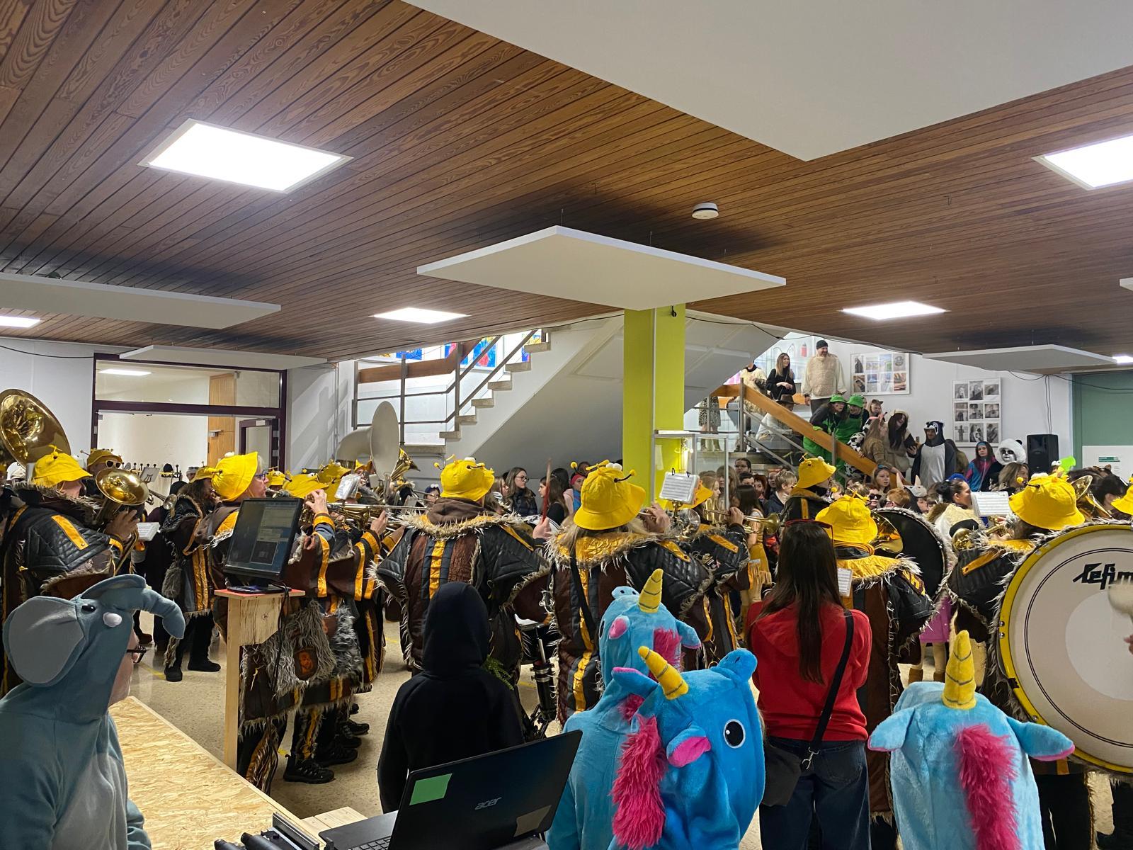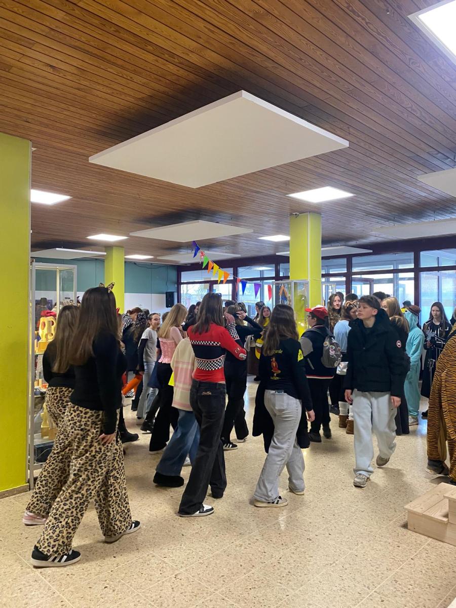 Im Anschluss startete die von der SMV organisierte Fasnetsdisko in der Aula. Das Untergeschoss der Schule war erfüllt von Musik, Klatschen und guter Laune, sodass niemand still sitzen bleiben konnte, viele sangen und tanzten begeistert mit. Die Aula verwandelte sich nun in eine Tanzfläche mit moderner Musik und bunten Lichteffekten.
